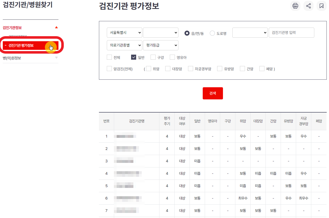 검진기관 평가정보를 눌러서 시/도를 선택하고 검사항목을 선택해 주세요