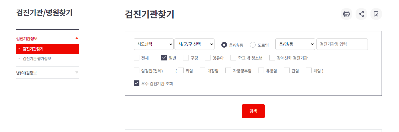 ② 시/도를 선택하고 검진받고 싶은 항목을 선택하여 검색해 주세요