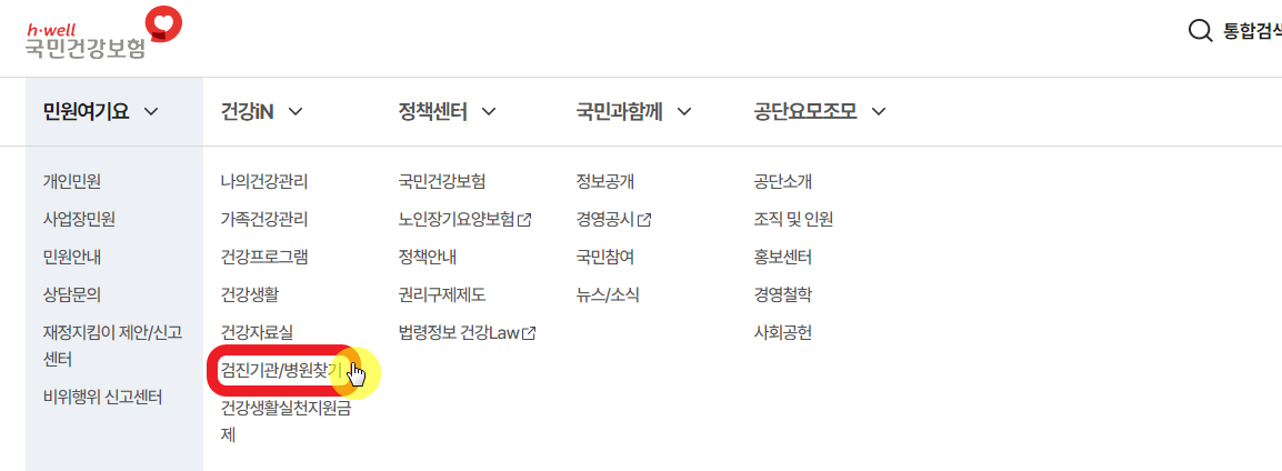 ① 건강 iN에서 검진기관/병원 찾기를 눌러주세요