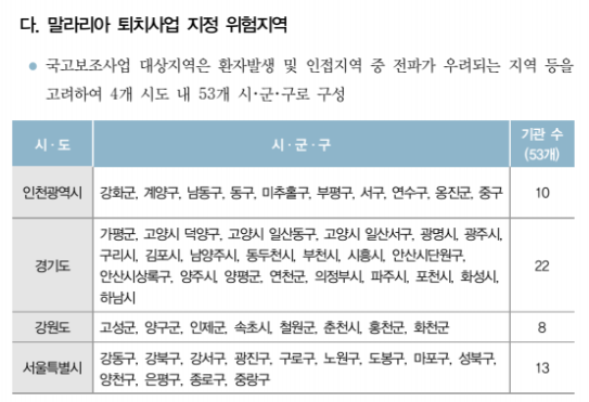 말라리아는 주로 파주, 연천, 강화, 인천 서구, 일산 서구등에서 발생합니다.