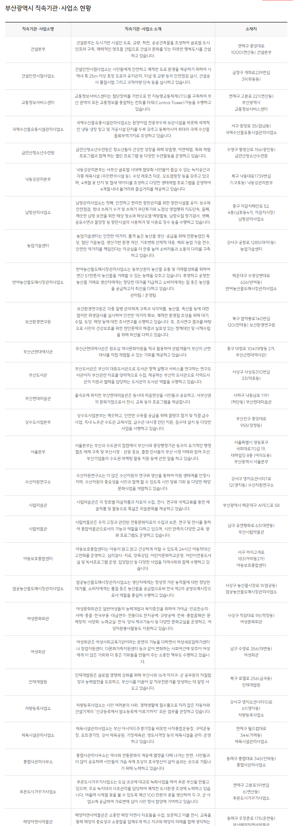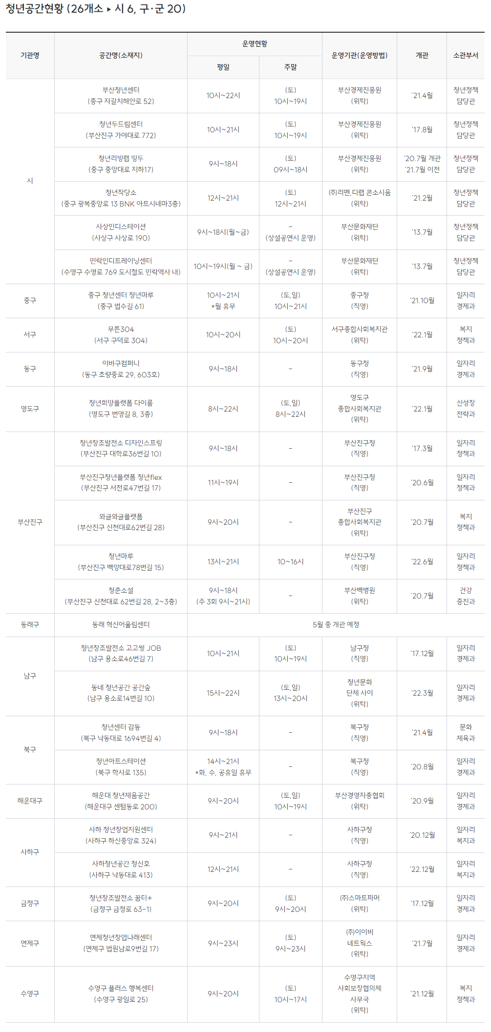 부산광역시 청년공간현황 및 직속기관·사업소 현황