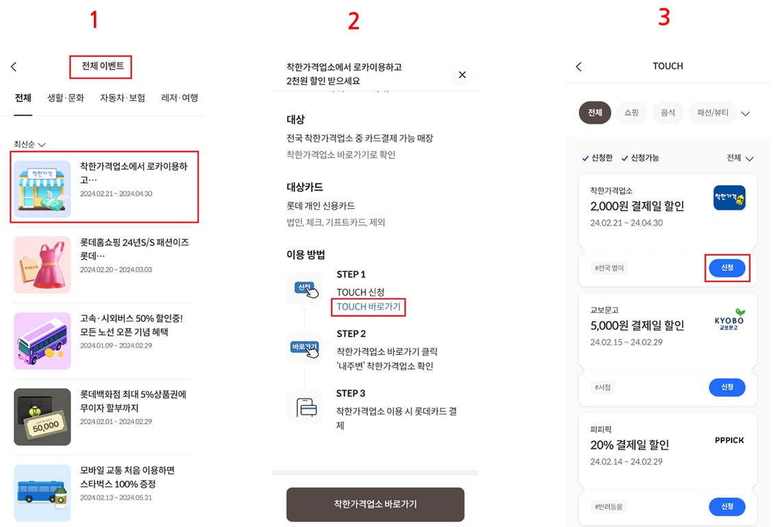 디지로카 앱 > 전체 이벤트 (진행 중인 이벤트) > TOUCH 쿠폰 신청 버튼 누르신 후 이용하시면 됩니다!