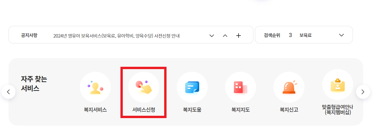 복지로 홈페이지 자주 찾는 서비스에 서비스 신청을 누릅니다