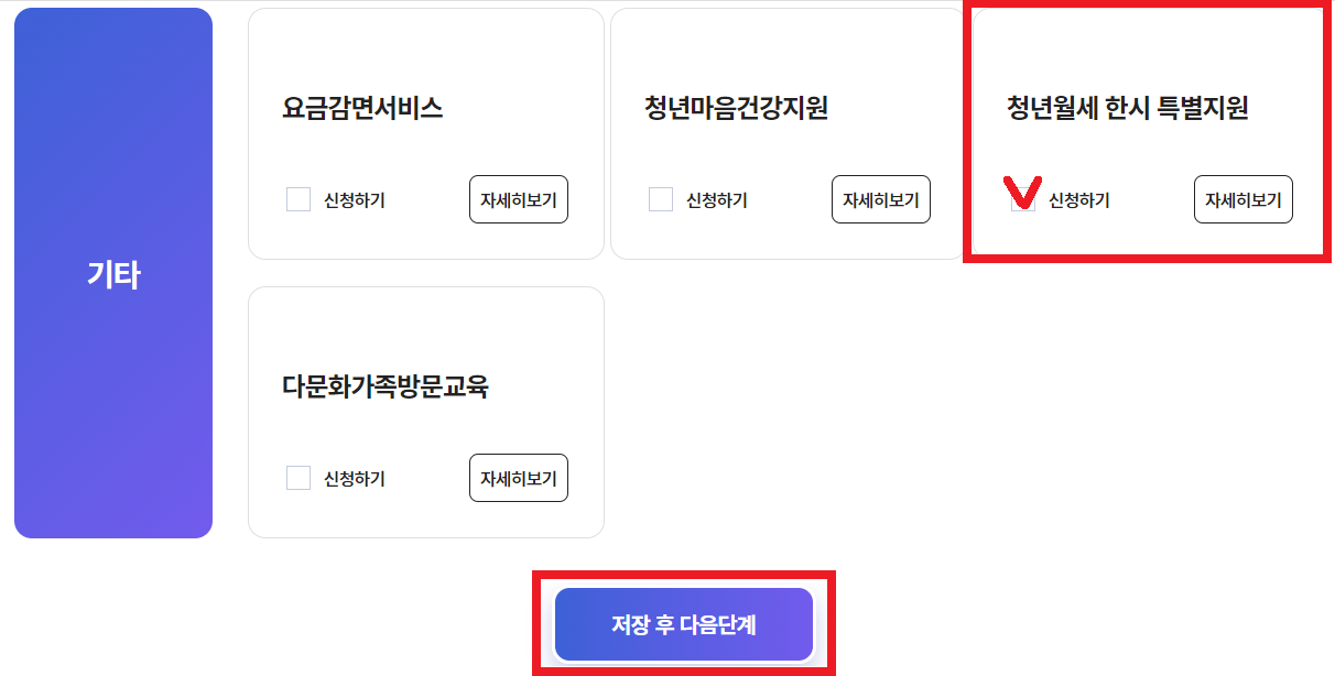 스크롤을 맨 아래로 내리면 청년월세 한시 특별지원항목이 나옵니다. 체크 한 후 저장 후 다음단계를 눌러서 신청해주세요