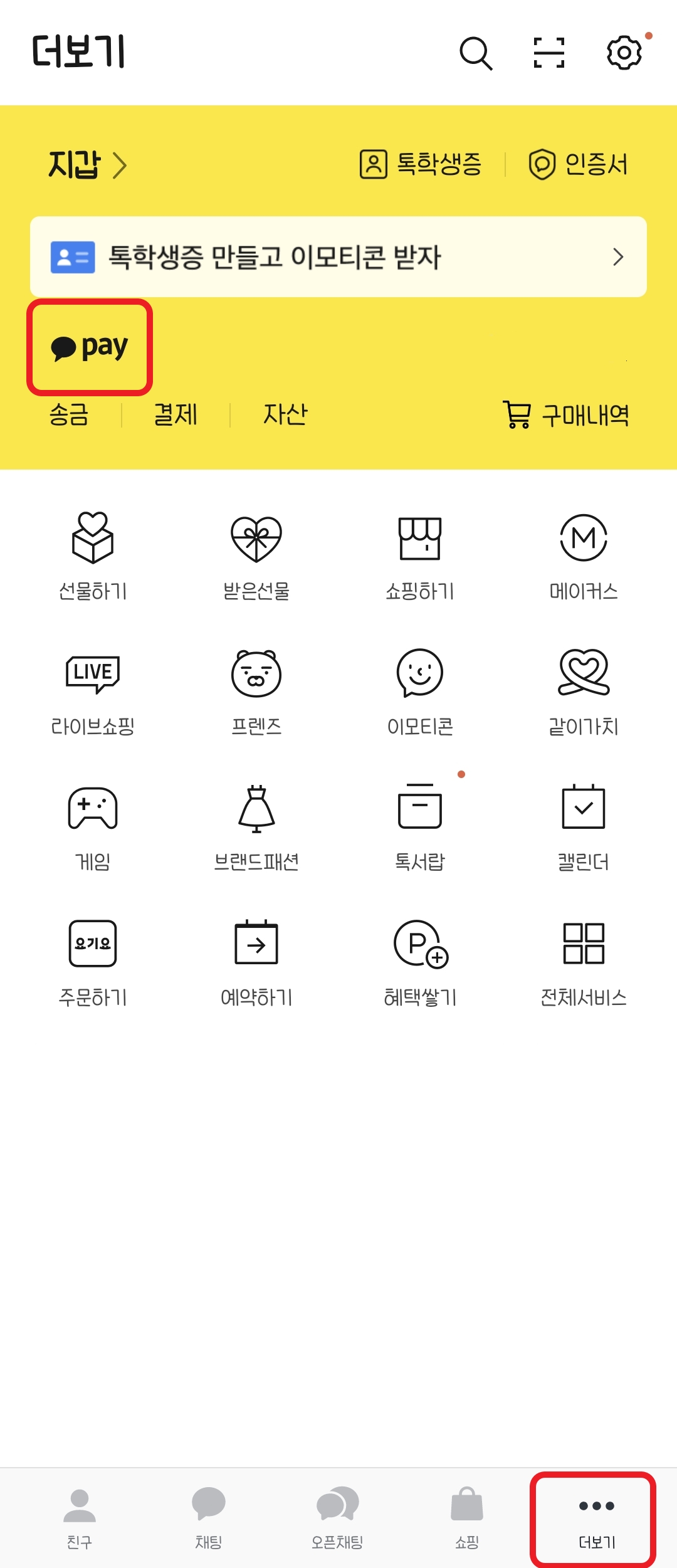 ① 카카오톡 더보기 에서 pay를 눌러주세요