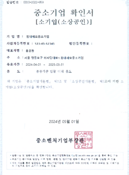 중소벤처기업부에서 "중소기업확인서(소상공인)"을 발급받은 소상공인