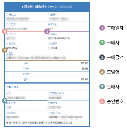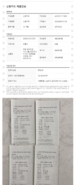 | 거래내역서 (구매내역서) 구매자 성명, 품목, 모델명, 구매금액, 구매일시, 구매매장명(사업자번호), 직인(서명) 서류명이 거래내역서가 아니어도 구매한 내역을 입증할 수 있는 서류 |
