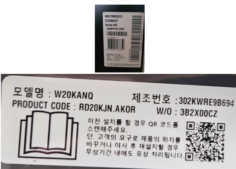| 제조번호(명판) | ![]() 사진 촬영시 모델명과 제조번호가 잘 보여지도록 촬영해주셔야 합니다 명판은 품목-제품별로 형태와 위치가 다양하므로 판매처에 문의하여 사전에 명판위치를 확인해주세요 |