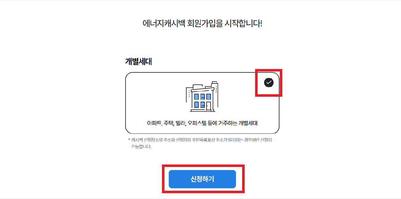 이사 등으로 주소지가 변경되는 경우 변경된 주소지로 다시 신청해주셔야 합니다. 이전주소지에서 산정된 캐시백은 지급이 제외됩니다.
