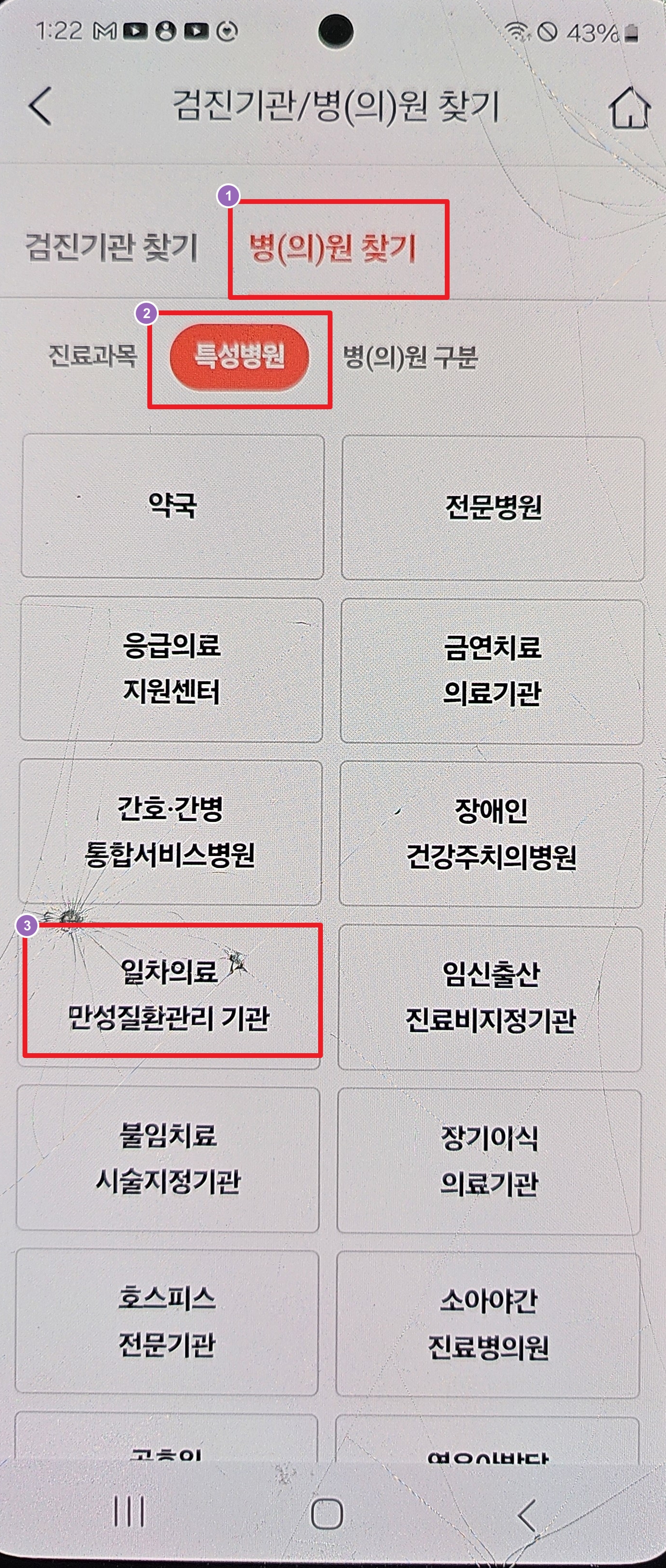 왼쪽 하단에 전체메뉴를 눌러주세요 → 왼쪽 중간에 건강 iN누른 후 검진기관/병(의) 원 찾기를 눌러주세요 → 병(의) 원 찾기를 눌르신다음 특성병원을 선택하고 일차의료 만성질환관리기관을 눌러주세요