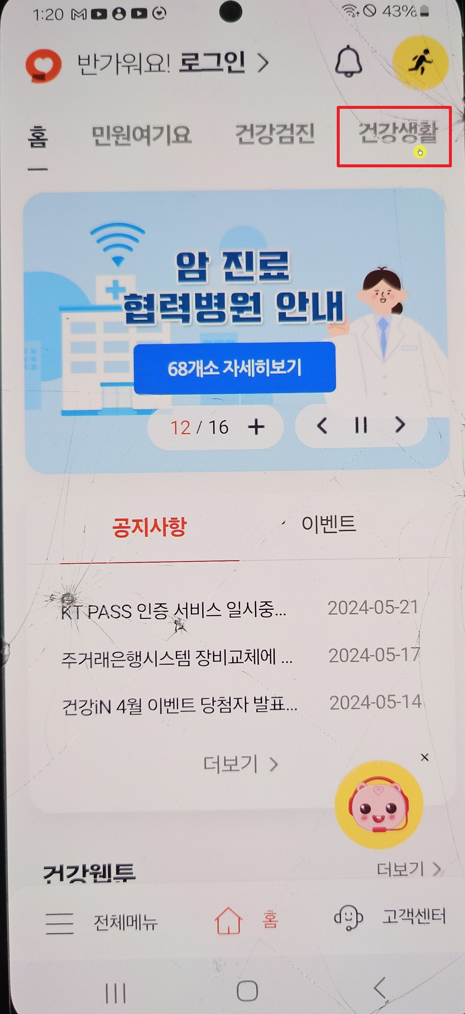 로그인 후 건강 iN에서 검진기관/병원 찾기를 눌러주세요