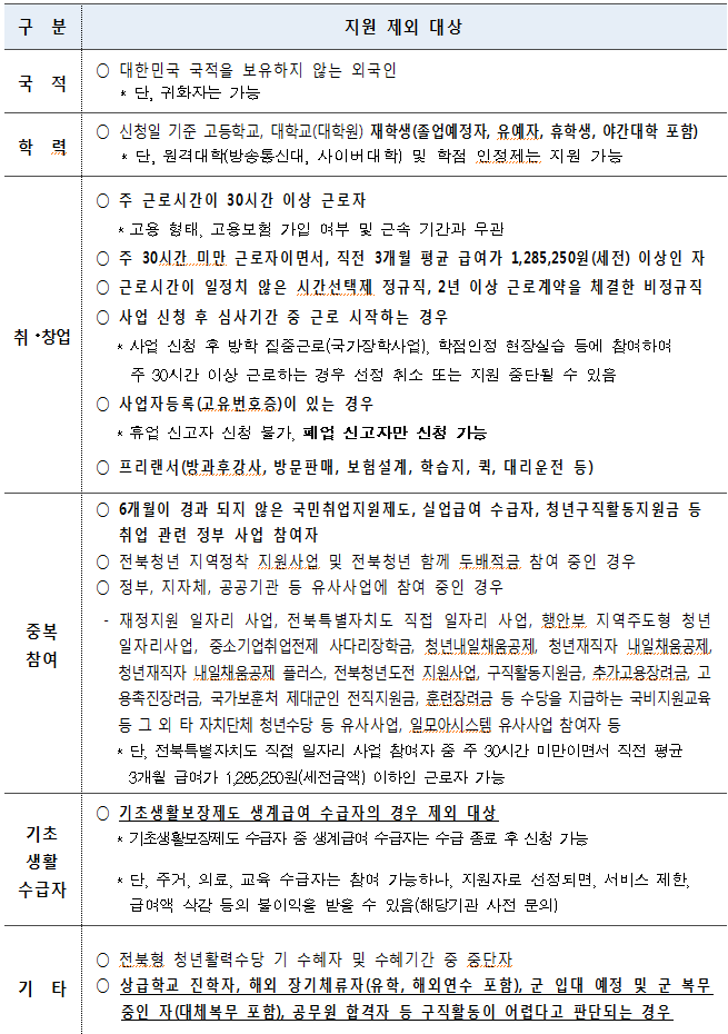 대한민국 국적을 보유하지 않은 외국인, 재학생, 취업 창업상태인 자, 중복참여자, 기초생활수급자, 군입대 및 공무원합격자, 상급학교진학자, 해외장기체류자는 신청대상에서 제외됩니다